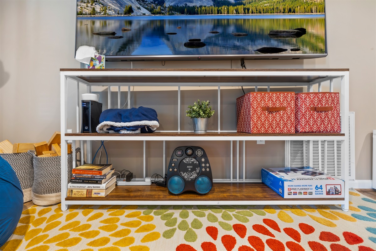 Large flat-screen TV with streaming services for family movie nights.